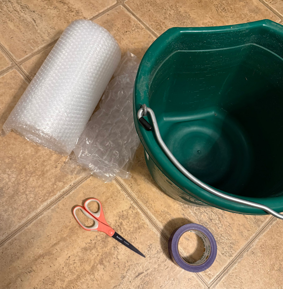 1. Wrap the bucket once with bubble wrap, tape to keep secure.