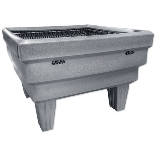 The Hay OptiMizer for Paddocks is a slow feeder that's proven to keep hay clean, be safe and durable, and quick to refill. And the best thing, less than 1% of hay fed in an OptiMizer is wasted on the ground. The paddock feeder holds up to 250 pounds of hay from square bales and will easily feed up to four horses together. Horses slowly graze hay with their heads down in a natural position. Hay consumption is controlled by a durable and gentle knotless net that drapes over the hay. The net is mounted on a stainless steel assembly that quickly slides open to refill hay. The manger and legs are made of the proven polymer that is used to make playground equipment. All the corners are rounded or beveled for safety and there are drainage holes to keep hay fresh. There are handholds on the front and back, making it easy for a person to move it around a paddock by hand.