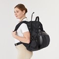 A feature packed backpack for all of life’s equestrian adventures, this stylish bag in Kerrits exclusive Chevron Bits design is reinforced with faux leather accents where durability matters most. Padded mesh lined shoulder pads are ergonomically contoured to fit a woman’s shape. In addition to the roomy main dual zipper compartment, storage solutions have been specifically designed for a helmet, riding crop, laptop, water bottle, sunglasses and phone, and keys so the essentials stay organized, and riders can be ready no matter what the day holds.
