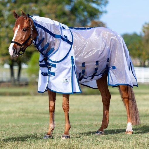 Ideal for sensitive horses that are especially bothered by bugs, the SmartPak Fine Mesh Fly Sheet protects from pests while allowing for maximum breathability. The lightweight, fine mesh keeps your horse cool, comfortable, and shielded from even the smallest insects. An extended belly band and three closures on the removable neck rug ensure extra coverage. Quick clip front closures adjust for a secure fit that's easy to throw on for turnout or take off.